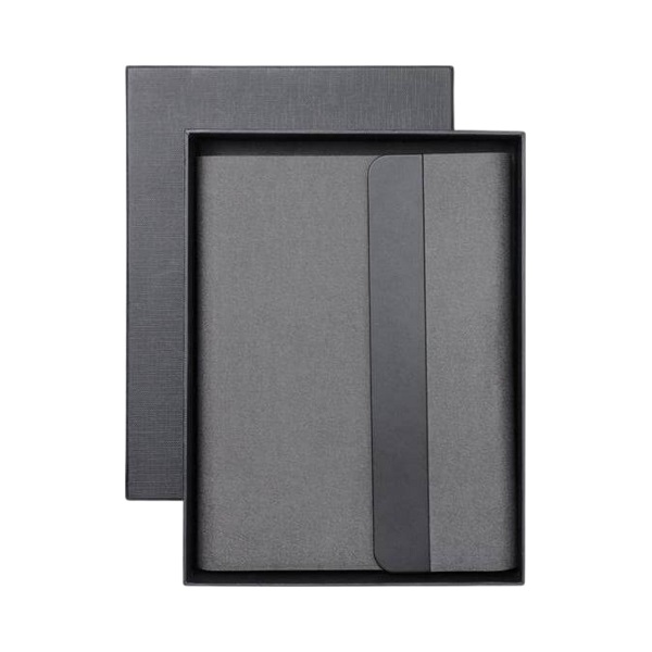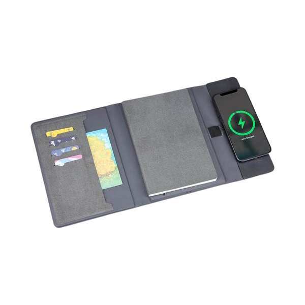 A5 notebook portfolio made from recycled PU with an integrated 10,000mAh magnetic wireless powerbank (15W) and refillable notebook.