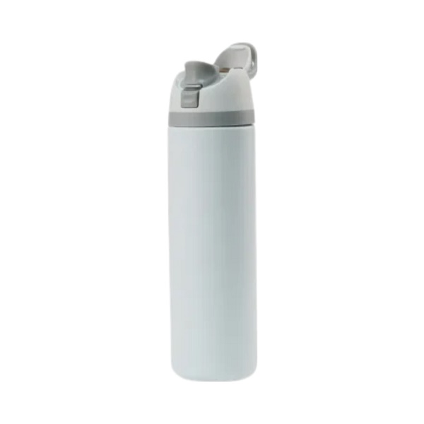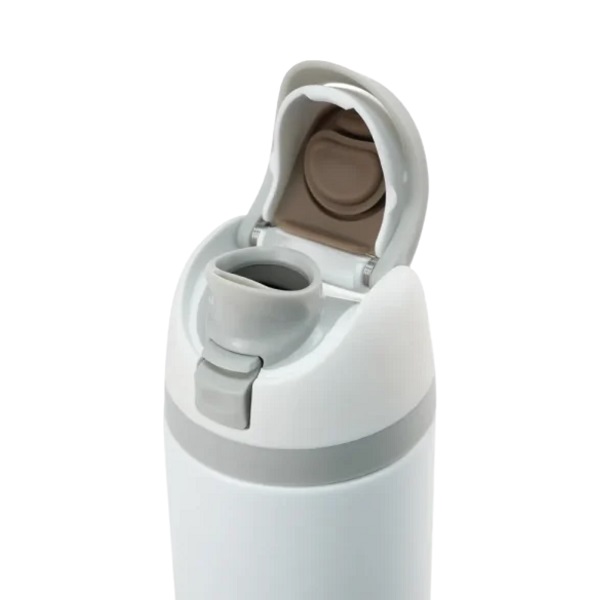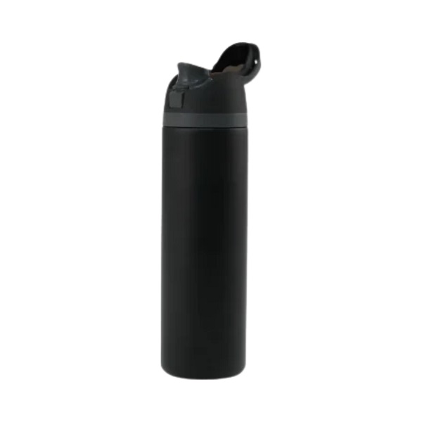 Double-wall stainless steel bottle with push-button lid and built-in straw. Keeps beverages hot or cold for extended hours. Matte oil finish in Black and White. Size: 275 × 80 mm. Weight: 520 g. Capacity: 1 litre.