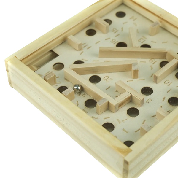 Wooden labyrinth board game with silver metal ball for balance and focus. Size: 115 × 27 × 115 mm. Weight: 88 g.