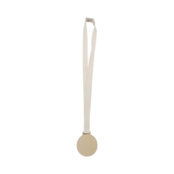 Sustainable bamboo medal with soft cotton lanyard and wheatstraw safety break. Size: 2 × 90 × 7 cm.