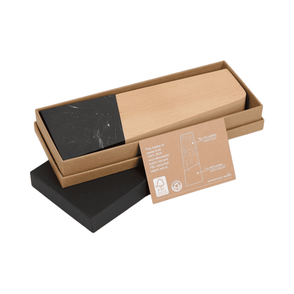 Trophy made from recycled water bottle caps and upcycled wood. Size: 9.5 × 3.0 × 24.0 cm. FSC-certified packaging with thank-you card.