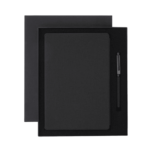 Recycled PU gift set with refillable A5 notebook and pen. Elegant design, carbon-zero certified. Size: 21 × 25.2 cm.