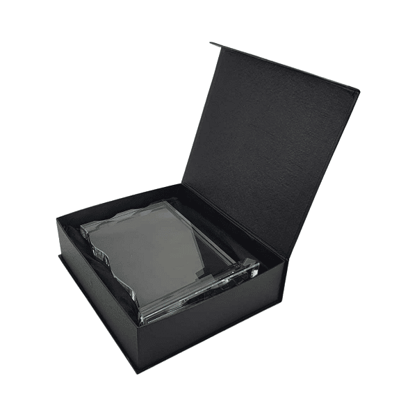 Rectangular crystal awards with a glass base in black carton gift box. Perfect for corporate recognition. Weight: 1.500 kg