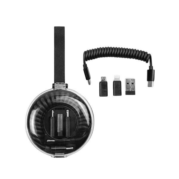 A compact charging kit with an extendable 85cm spiral Type-C cable and adapters for USB-A, Micro-USB, and Lightning. Supports 60W fast charging.