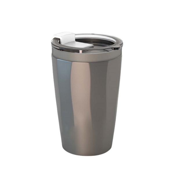 Sleek double wall vacuum insulated tumbler with ergonomic geometric design for better grip. Made of 304 stainless steel. Keeps beverages hot or cold for hours. Capacity: 330 ml. Size: 13.2 × 8.8 cm. Packaged in gift box.