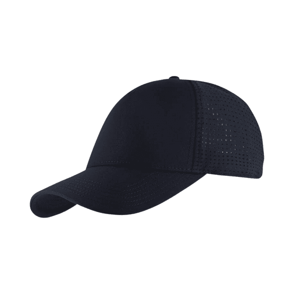 Structured-fitted 5-panel sports cap with DryNCool moisture management, curved visor, and adjustable metal buckle. Laser-cut ventilation holes for breathability.
