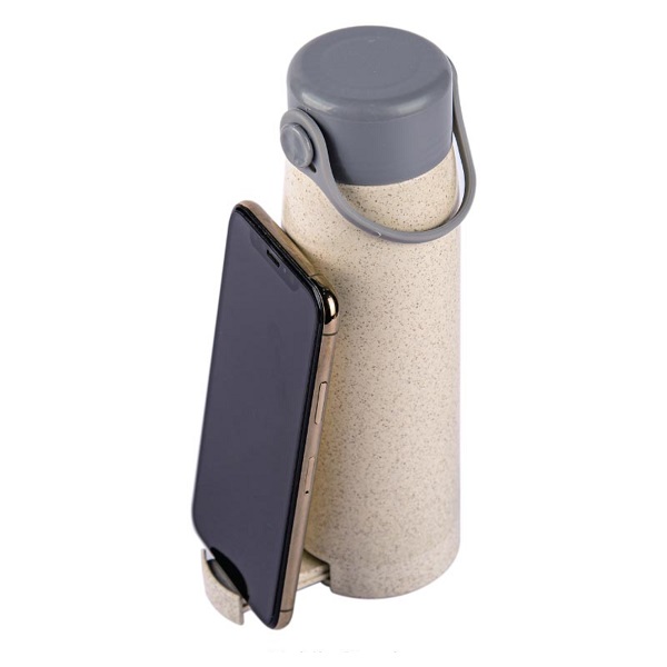 Eco-friendly water bottle with glass interior and wheat straw exterior. Features a handle for easy carrying and a phone stand at the base. Capacity: 380ml. BPA free. Packaging: Gift Box.