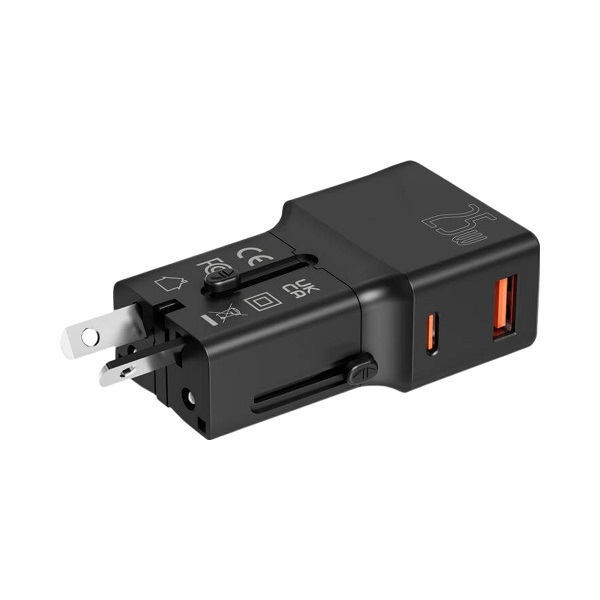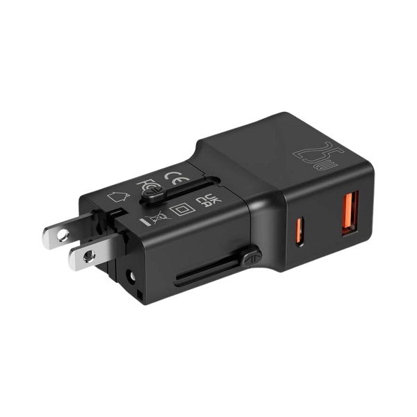 Pocket-sized world travel charger with USB-C and USB-A ports supporting fast charging up to 25W. Includes US, UK, AUS, and EU plugs. Size: 50 × 50 × 50 mm Volume: 0.125 cdm³ Net Weight: 0.116 kg