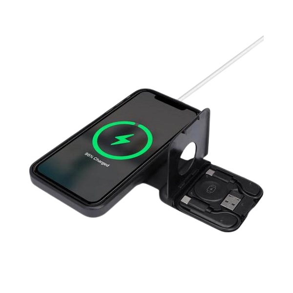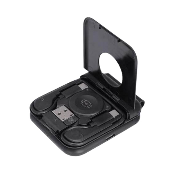 Foldable 15W wireless charger and multi-cable set. Compact design with storage for cables, SIM cards, and ejector pin.