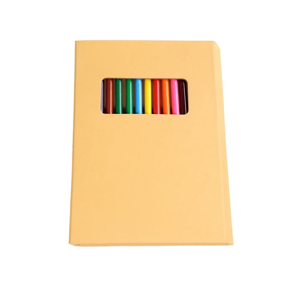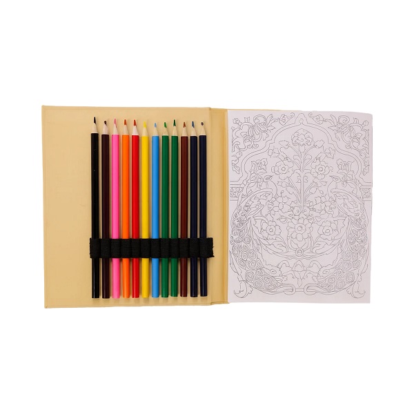 Portable A5 coloring set with 50 patterned sheets and 12 coloring pencils. Size: 14.9 × 21 × 2.5 cm.