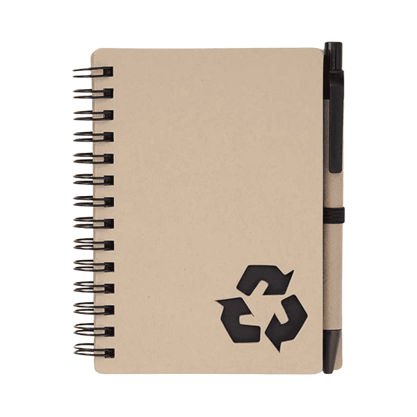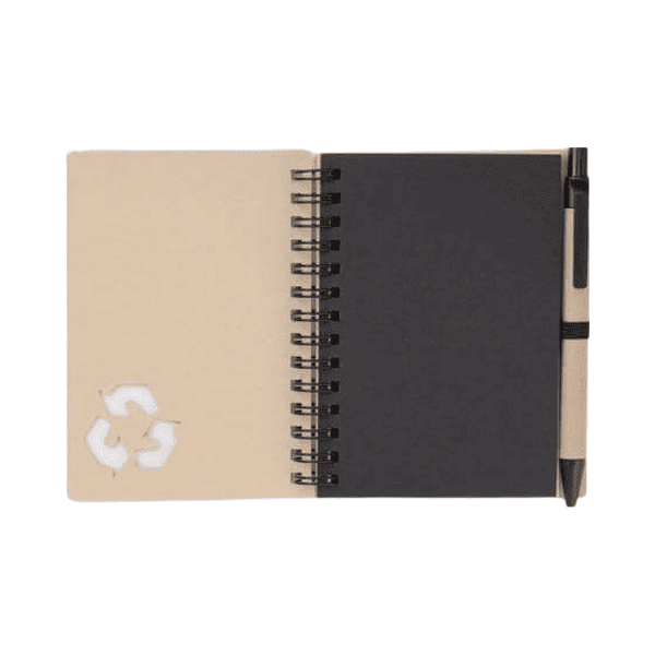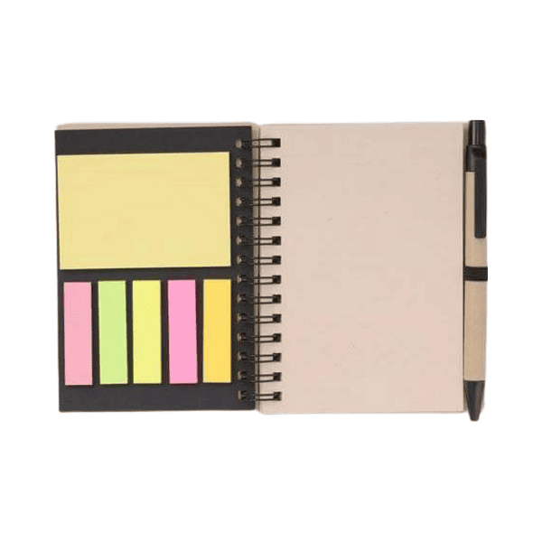 Compact eco-friendly set including an A6 notepad with a recycled kraft paper cover, sticky notes, and a matching pen.
