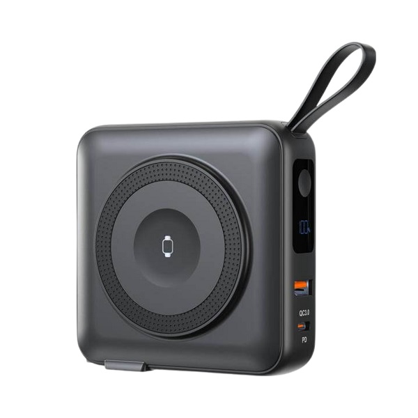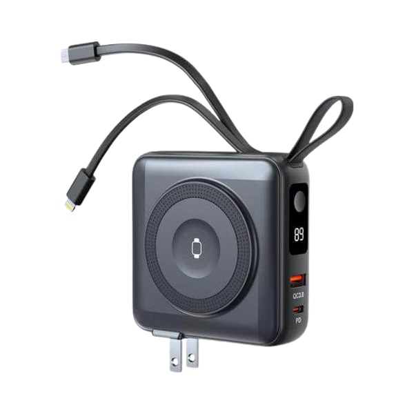 10,000mAh universal travel powerbank with interchangeable global adaptors, 15W magnetic wireless charging, and built-in Type-C and Lightning cables. Net Weight: ~0.350 kg (Approx.)