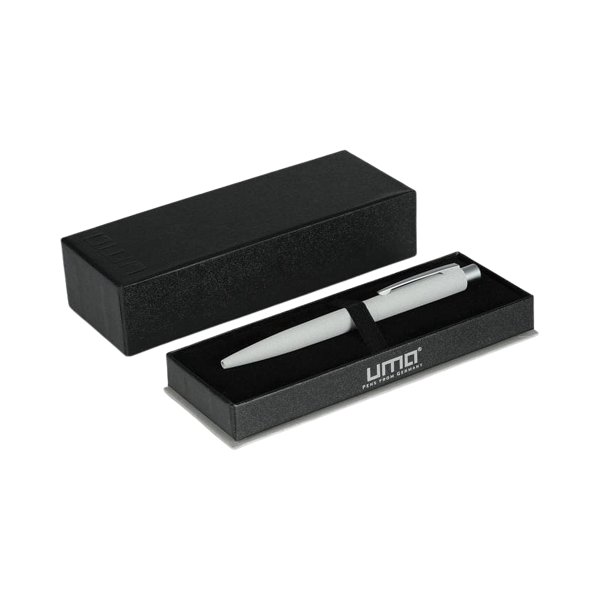 The Uma- Lumos is a retractable metal ballpoint pen with an exclusively designed exterior to give it a reconstructed concrete or stone look and feel. The Uma Lumos Stone pen has a metal clip and a push button in matted chrome. This elegant stone pen contains a 1.0 mm high-quality refill with blue German ISO-compliant ink. This pen has been manufactured in a climate-neutral certified factory in Germany, making it an environment-conscious corporate gifting item.