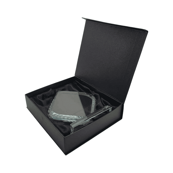 Rhombus-shaped crystal awards with engraved design, packed in black carton gift box. Weight: 1.188 kg