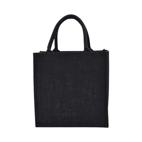 Durable jute bag with lamination, reusable and eco-friendly. Soft handles for comfortable carrying. Size: 30 × 30 × 15 cm.