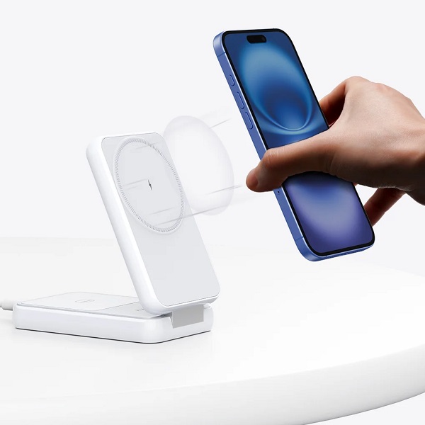 Optimize your workspace with the QUANTUM 3-in-1 Foldable Wireless Charger. This 15W fast-charging powerhouse simultaneously powers your iPhone, Apple Watch, and AirPods in a sleek, ultra-portable, and compact design perfect for travel and office use.