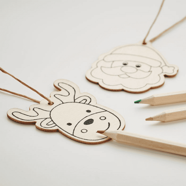 Set of 3 wooden Christmas ornaments with 4 colouring pencils. Presented in a kraft box. Dimensions: 9 × 9 cm. Weight: 0.025 kg.