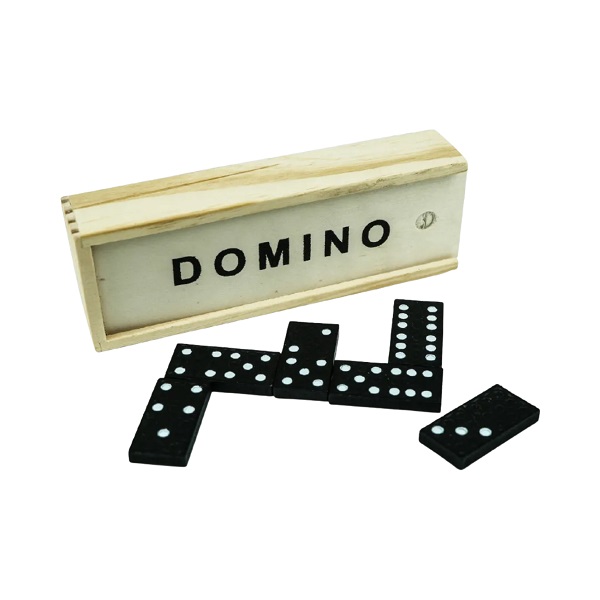 Classic domino set with 28 black wooden pieces in a sliding wooden box. Size: 145 × 30 × 50 mm. Weight: 122 g.