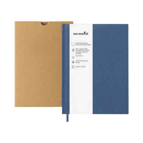 Stylish A5 notebook with a durable hard cover made from recycled denim fabric/paper, containing 160 ruled FSC-certified pages.