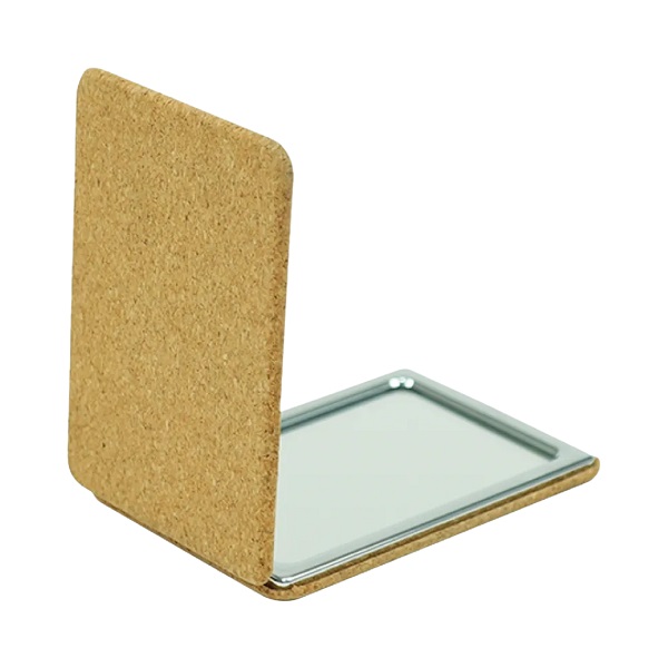 Compact double-sided foldable pocket mirror with cork finish. Size: 62 × 10 × 87 mm. Weight: 71 g.