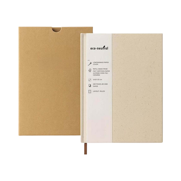 Eco-friendly A5 notebook featuring a unique cover made from lemongrass fibers and 160 pages of FSC-certified ruled paper.