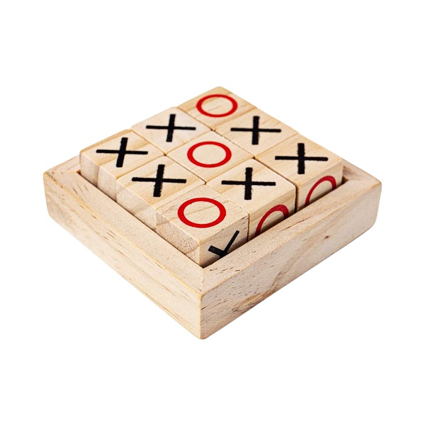 Pine wood tic-tac-toe game with plywood blocks. Size: 8.05 × 8.05 × 2.25 cm.