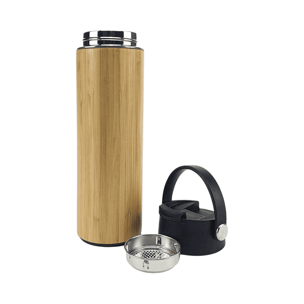 Eco-friendly 500 ml bamboo and stainless steel flask with clip-in infuser for tea or coffee. Double insulated. Size: 6.5 × 23.5 cm.